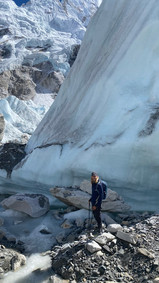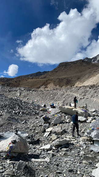 Blij als we zijn lopen we rond over het terrein. Gezien het niet het seizoen is om de Mount Everest te beklimmen staat er geen tentenkamp opgebouwd. Eigenlijk kijken we dus gewoon naar een paar stenen met wat vlaggetjes haha. De rest stellen we ons er maar bij voor. We lopen nog een stukje naar beneden om bij de ijsrotsen te kunnen kijken. Zittend op een steen luister ik naar het ijs dat kraakt en soms afbreekt, heerlijk.
